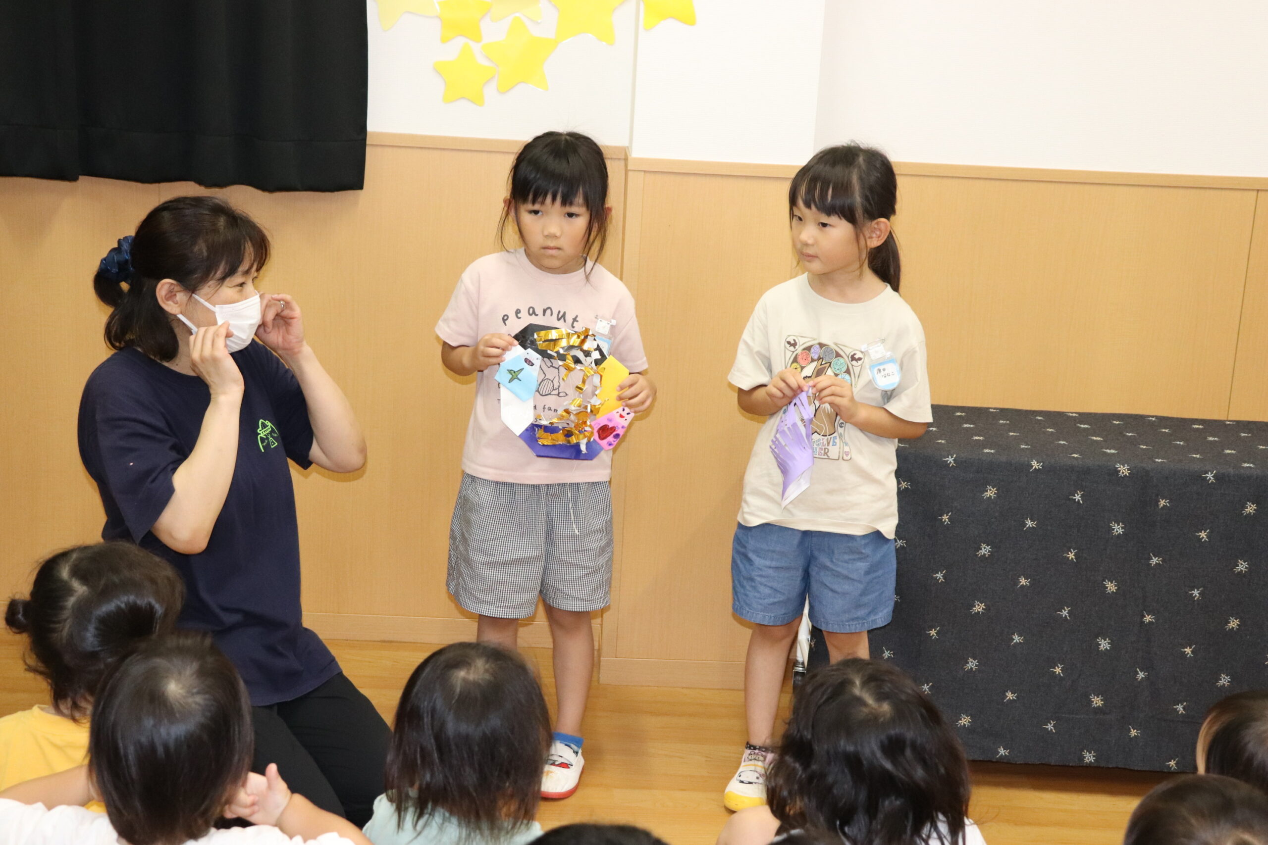2022.07.07 園の様子(かみつるま), 明徳かみつるま保育園 明徳かみつるま保育園【七夕集会】 今日は7月7日、七夕!!みんなでおひさまルームに行って七夕集会をしました。 各クラス、どんな七夕飾りを作ったのか発表しました☆ 素敵な七夕飾りが出来ました。